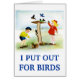 Une image fantaisiste d'enfants qui nourrissent les oiseaux, et même qui aiment la compagnie d'un écureuil affamé. La légende dit que je mets dehors pour les OISEAUX. Une carte mignonne pour les amateurs d'oiseaux qui sortent.