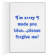Adorable chien de chiot bleu aux yeux tristes adorables qui feront que quelqu'un vous pardonne. Cela leur réchauffera le coeur avec un nom personnel sur le devant et un joli message à l'intérieur. Je suis désolé de vous avoir rendu bleu, pardonnez-moi. Vous pouvez changer le message en autre chose si vous le souhaitez. Artistique, unique et amusant. Personnalisez-le en ajoutant du texte à la zone blanche. Ajoutez votre nom, une date, une initiale ou tout ce que vous voulez!