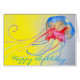 Original art hand drawn illustration of a jellyfish painted in watercolour by artist Sacha Grossel. This whimsical sea creature is on a beach themed background of yellow sand and blue ocean. A customisable jellyfish birthday card.