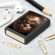 Jezus staat op een berg met uitzicht op een vallei met een rivier erdoorheen. De scène is gesneden in een leren paneel met ingewikkelde details.