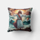 Jezus staat vol vertrouwen op rotsachtige kusten en steekt zijn armen op terwijl turbulente golven om hem heen neerstorten, en toont goddelijke vrede te midden van chaos bij zonsondergang.