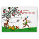Happy Johnny Appleseed Day, papieren wenskaart. Kaart toont een schattige afbeelding van Johnny Appleseed die een menagerie van dieren en insecten leidt terwijl hij appelzaden op de grond verspreidt. Een grote appelboomtak geladen met rode appels is achter hen. Kunst, afbeelding en vers copyright © Shoaff Ballanger Studios.