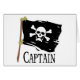 Een Jolly Roger pirate vlag en ondertitelkapitein beschikbaar op Pirate T-shirts, Buttonnen, Magneten, Canvas tassen, Aprons, Sweatshirts, US Postage, Note Cards, Muismatten en nog meer leuke piratencadeaus. Klik op de link Aanpassen om een object aan te passen door een naam of je eigen bericht toe te voegen.