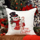 Pillow heeft een jolly sneeuwman met een rode sjaal en een zwarte bovenste hoed terwijl hij aan de ene kant een kruis van heilige bessen en bessen en aan de andere kant een snoepstok draagt, met de woorden "Vrolijk kerstfeest" in rood decoratief schrift.