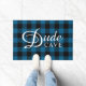 Unieke, elegante en decoratieve moderne boerenstijl doormat met schattige Kerst citaat tekst, op een ruige blauw en zwart gekleurde Buffalo Lumberjack tartan controleert patroonontwerp.