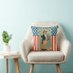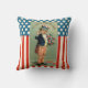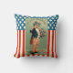 Deze kussen bevatten een illustratie van een jonge jongen die verkleed is als oom Sam die '4 juli-groeten' verkondigt terwijl hij een boeket bloemen vasthoudt. De achtergrond toont de sterren en strepen van de Amerikaanse vlag in rode, witte en blauwe kleuren.