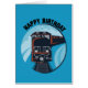 Une carte d'anniversaire très mignonne pour envoyer vos meilleurs voeux lors d'un jour de fête. Un train noir sur un arrière - plan bleu aux fenêtres rouges. Une illustration appropriée pour un petit garçon, un adolescent et même une drôle de surprise pour un homme qui aime les véhicules.
