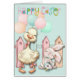 C'est une jolie carte de voeux de la saison de Pâques qui présente un joyeux canard jaune souriant tenant un tas de ballons de couleur pastel. Le canard se tient devant une clôture de piquetage pastel assortie, et un petit lapin lapin blanc abrite un petit bouquet de fleurs. Le texte coloré dit Joyeux Pâques. Les images et le texte sont placés sur un arrière - plan vert pastel clair. L'intérieur de la carte contient deux champs de texte supplémentaires que vous pouvez customiser.