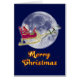 Une carte de Noël joyeuse montrant le Père Noël à cheval dans son traîneau tiré par un renne. Ils volent au-delà de la pleine lune dans le ciel. Une bonne carte pour dire Joyeuses vacances à vos amis et votre famille.