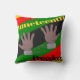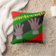 Dit kussen heeft een Juneteenth ontwerp van handen in gebroken kettingen met een achtergrond van rode, gele, groene en zwarte lijnen.