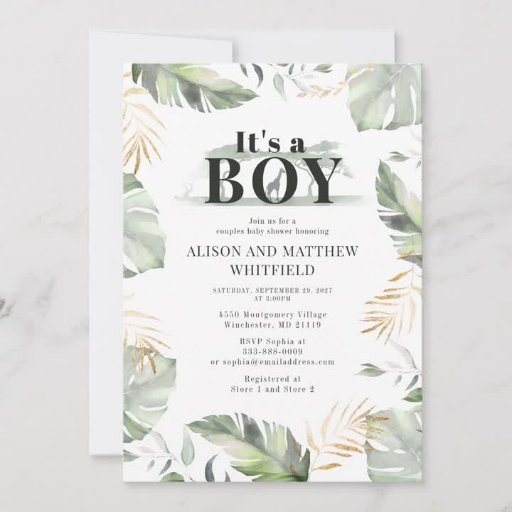 Invitation au baby shower animal safari de garçons sauvage, calme et élégant, avec girafe, effet or et feuilles verts. Idéal pour les invitations pour les douches pour bébés garçons