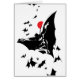 Bekijk deze noir-achtige komische kunst van de Batman van de Justice League die door de lucht stroomt onder een wolk van vleermuizen. Deze zwarte en witte pop wordt gecompenseerd door een heldere rode maan aan de hemel.