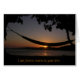 Kaart met de boodschap "Ik ben altijd warm in je liefde" boven een afbeelding van een hammock in de zonsondergang.