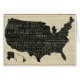 © Pela Studio / Wild Apple. Een zwarte en beige kaart van de Verenigde Staten. Het continent is zwart gekleurd met de namen van de staten die er over geschreven zijn.
