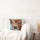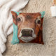 Sweet kalf kijkt verbijsterend naar de kijker in dit schilderij dat op een kussen is geplaatst. De blauwgroen achtergrond van het water is zacht en contrasteert goed met het bruine kalf.
