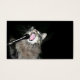 Grijze tabby kat zingt in een microfoon, amuserend en comisch karaoke visitekaartje