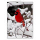 De mannelijke Kardinaal maakt een aardig contrast, met zijn heldere rode rond veren, tegen de sneeuwtakken allen.