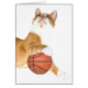 Sinaasappel en witte kat houdt vast aan het basketbal terwijl hij opkijkt naar het wenskaart van de foto van de mandje