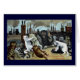 Katten vechten op de daken terwijl schoorstenen rook in de lucht spuiten in een schilderij van Louis Wain uit 1910.
