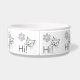 Hallo tekst en tekeningen van een kattengezicht met groene ogen en een poot. Kattengroeten. Een grappige kom voor huisdieren of katten.