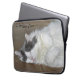 Foto van een vloeiend, Maine Coon Cat-rustend, weergegeven op een laptophoes. - Dit is mijn 11-jarige Maine Coon-kat die een pauze neemt om te spelen. — Foto is auteursrechtelijk beschermd door mij, de fotograaf.