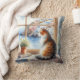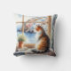 Decoratorkussen met het kattenschilderij van een waterverf die in een venster zit en uitkijkt naar kleurrijke mediterrane huizen aan zee.