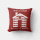 Cottage gooien kussen. Rode buffel gooien kussen met cabine en Welkom in onze Cabine.