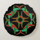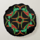 Dit ronde kussen is versierd met een afbeelding met in elkaar grijpende lintachtige vormen geïnspireerd door Keltische knoopkunstwerken, samen met kransen van holle bladeren en bessen, allemaal in een traditioneel kleurenschema van rood en groen met goudgele accenten.