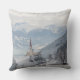 Gooi een kussen met de Sint-Pankraz-kerk in een alpenlandschap in de sneeuw omringd door wolken en mist op een heuvel met een uitzicht boven de Zillertal-vallei met de Alpen-bergen op de achtergrond in Fügen, Oostenrijk, in de winter. Geweldige decoratie!