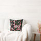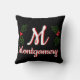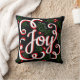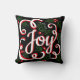 Feestelijk gooi kussen met het woord "Joy" in wit en rood schrift met bloeiwijzen, rode hulstbessen en groene design over zwart. De achterkant heeft de initiaal letter en de volledige naam van je familie.