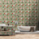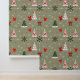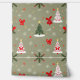 Een charmant vakantiepatroon met versierde kerstbomen, rode bogen, sneeuwvlokken en dennentakken op een zachte groene achtergrond. Dit feestelijke ontwerp vangt de warmte van het seizoen, perfect voor kerstinpakpapier, vakantiedecor of seizoensgebonden ambachten.