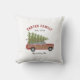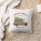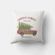 Illustratie van een houten gepanelde rode suv auto met vers gesneden kerstboom vastgebonden aan de top. Personaliseer de tekst.