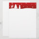 Moderne, minimalistische, eenvoudige kerstillustratie met witte silhouetten van rendieren, bomen, sneeuwpoppen en sneeuwvlokken met prettige kerstbegroeting op een rode achtergrond.