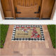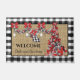 Welkom uw kerstbezoekers met dit feestelijke en unieke boerendeormat met een vintage kerstboom die is gedecoreerd in rood, zwart en zwart buffelpapier. Er is een tuin met kerstgroen met dezelfde decoraties en kleuren. De burlap achtergrond wordt omringd door een zwart-wit buffel controlepatroon. Pas je eigen gegevens aan.