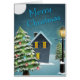 Kerstgroeten met bomen, sneeuw, huis- en straatlamp