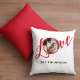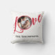 Dit ontwerp is voorzien van een Merry Christmas schattig kalligrafie script gooien kussen met liefde kalligrafie script belettering, een familie foto afbeelding sjabloon, rood en wit typografie ontwerp, stijlvolle trendy kalligrafie script lettertype, aangepaste cadeau bericht groet, een klassiek klassiek traditioneel winterontwerp, kerst vakantie foto home decor, kerstvakantie foto cadeau, een schattig creatief uniek typografie ontwerp