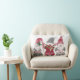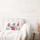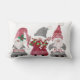 "Kerstkabouters houden van vreugde vrede typografie lumbale kussen." Schattig trio van kerstkabouters in rood en grijs met typografische tekst: "Love, Joy, Peace." Geschilderd in waterverf door Audrey Jeanne Roberts.