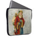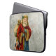 Een oud beeld van de klassieke kerstman met zijn beroemde rode jas en een tas vol speelgoed. Deze ouderwetse kerstman, ook bekend als de oude Sint-Nicolaas, is dun en heeft een wandelstok voor het reizen door het land van speelgoed dat alle meisjes en jongens cadeau geeft. De achtergrond is een oud en vervaagd -parisiaans reclamepervlak met een verbluffd weerswerk.