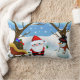 Wintery kerstscène. Een sneeuwwinterdag met een jolly santa met zijn slee vol cadeaus. Rechts een gelukkige sneeuwman in een sjaal en bovenste hoed die wacht om te zien wat Santa hem heeft gebracht.