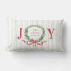 Dit kerstkussen heeft een typografisch ontwerp met een kerstkrans als de letter "o" in het woord vreugde. U kunt personaliseren met uw familienaam. De achtergrond aan de voor- en achterkant heeft een lichtgroene geschulpte streep.