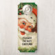 Een deurhanger die zegt: "Verstoort niet (de tekst kan worden veranderd/gepersonaliseerd) met een retro-afbeelding met een glimlachende gelukkige kerstman omringd door een dennenkruid met een holly in zijn pet.