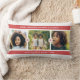 Modern kerst lumbaal kussen beschikt over 3 van uw favoriete foto's met sneeuwvlok afbeeldingen tussen foto's. Rode strepen aan boven- en onderkant met gepersonaliseerde tekst. Maakt een prachtig kerstcadeau.