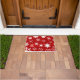 Een deurmat in kerstkleuren van rood en wit. Deze heeft een sneeuwvlokpatroon erop. Een zeer gastvrije aanvulling op uw vakantie decoreren.