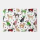 Kute kersthondenhonden met zwarte, flauwe, blauwe en rode jasjes, gekleed in feestelijke feestelijke kleding, kerstmantels en argeltruien met een versnipperd kerstsierpatroon.