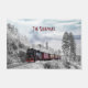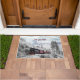Een gepersonaliseerde deurmat met een foto van een ijzig winterlandschap met besneeuwde dennenbomen. Een rode, gouden en zwarte ouderwetse trein die door het winterwonderland rijdt.