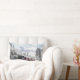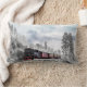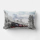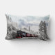 Een kussen met een foto van een besneeuwd winterlandschap met besneeuwde dennenbomen. Een rode, gouden en zwarte ouderwetse trein die door de wildernis rijdt. Het roept gedachten op om naar huis te komen voor Kerstmis.