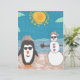 Een sneeuwman en een pinguïn brengen een vakantie naar het strand.