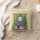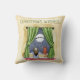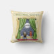 Kussen met een grillige waterverf schilderij. Een jong kind in pyjama en haar kattenpoes kijken uit hun raam op kerstavond. De Kerstman en zijn rendieren vliegen over de nachtelijke hemel in silhouetvorm met een grote volle maan die hun pad verlicht.