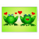 Cartoon kikkers in liefde, mannetjes en vrouw kikker, schattig, grappig en expressief, rood hart, gradiënt groene / gele achtergrond, blanco binnenzijde. Hoppy zegeningen van Happy Wishing Well dot com.