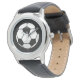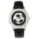 Kinder klassiek zwart lederen bandhorloge getoond met een voetballen print. Kies dit horloge uit verschillende stijlen. Pas dit horloge aan of koop het zoals het is. Stock Afbeelding